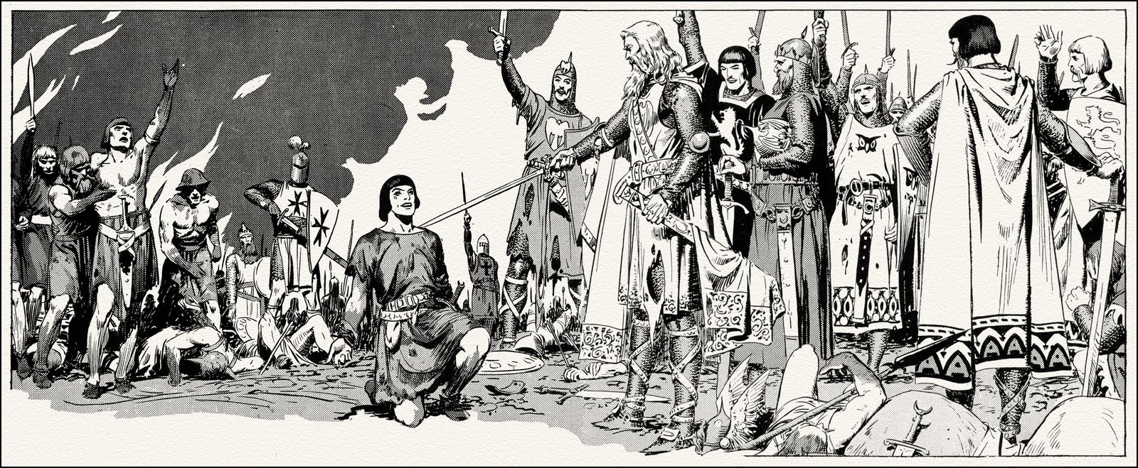Sí podemos señalar un cambio bastante interesante con respecto a lo que encontramos en las historias tradicionales del mundo artúrico. El monarca siempre había permanecido inalterable en su trono mientras los caballeros partían a la aventura, hasta que llega el momento decisivo en las llanuras de Salisbury en La muerte del rey Arturo. Ahora, en esta historia gráfica, el rey es representado en un primer momento, como un anciano, aunque todavía sale a cazar, ciertamente, al fin y al cabo este es el ejercicio que les queda a aquellos que abandonan las armas; sin embargo, en la soledad de su alcoba, de noche, mientras una exultante Ginebra es secuestrada por el representante del mal, Arturo más parece un anciano protegido de los fríos de la noche con un camisón y un gorro de dormir. Con todo y con eso, el rey partirá acompañado por Merlín a la búsqueda de su reina, hacia la gesta en la que la luz se enfrenta a la oscuridad absoluta de los infiernos, principio inalterable del mito que permanece más allá de las transformaciones que de él se hagan.