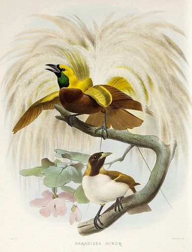 “Eran algo mayores que pichones, casi del tamaño de gallinas, con la cabeza de un amarillo dorado en la parte inferior y verde oro en la superior; el dorso era castaño con reflejos también dorados, la cola rizada de tonos multicolores, lo mismo que las alas, de debajo de las cuales les salían como una especie de borlas de fino plumón amarillo pálido con reflejos plateados. Alumbrados por los rayos del sol, que producían en aquellas soberbias tintas reflejos brillantísimos, no parecían aves, sino ramilletes de flores salpicados de pedrería”.