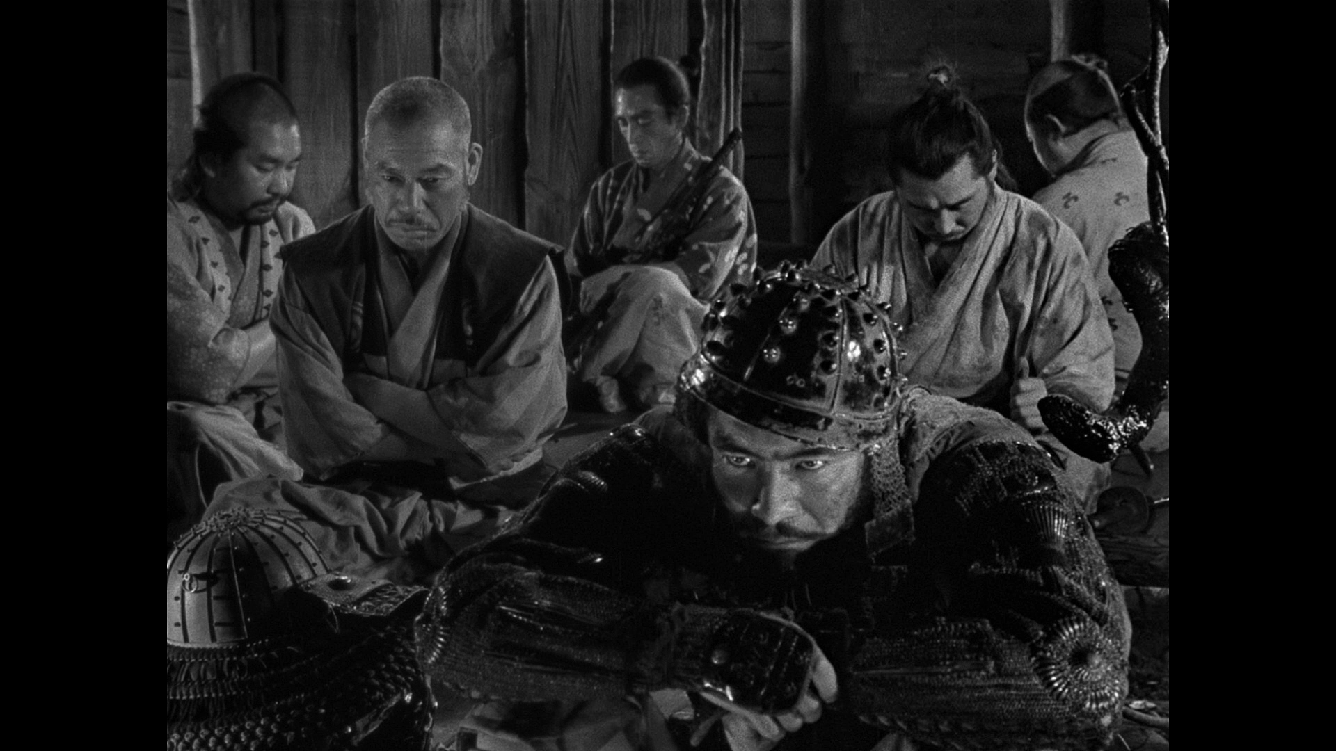 Cuando Kambei se compromete en la batalla de los campesinos, organiza una prueba con la cual pretende conocer la maestría de los candidatos a integrarse en su grupo. Katsushiro, el joven que quiere ser discípulo de Kambei, se ocultará en el quicio de la entrada y golpeará al samurái que vaya a entrar (como si fuese el cojín que Bokuden utiliza para probar a sus hijos). El primer samurái convocado entra y detiene la rama con la que Katsushiro le ataca, a la vez que lo hace rodar por los suelos. Con ese gesto demuestra su maestría; pero no acepta el compromiso hacia los campesinos que le ofrece Kambei. El segundo ni siquiera llega a acercarse a la puerta, pues es consciente de la trampa. Este es Gorobei, uno de los que formarán el grupo de los siete que va a defender la aldea. Indudablemente demuestra una experiencia mayor que la del anterior y un humanismo que se refleja tanto en su sonrisa cuando se da cuenta del engaño como en la aceptación de la empresa. La estrategia preparada por Kambei se utilizará por tercera vez con Kikuchiyo, el personaje interpretado por Toshiro Mifune, el cual, borracho como una cuba cae en la trampa y es golpeado duramente, lo cual origina uno de los fragmentos más cómicos de la película.