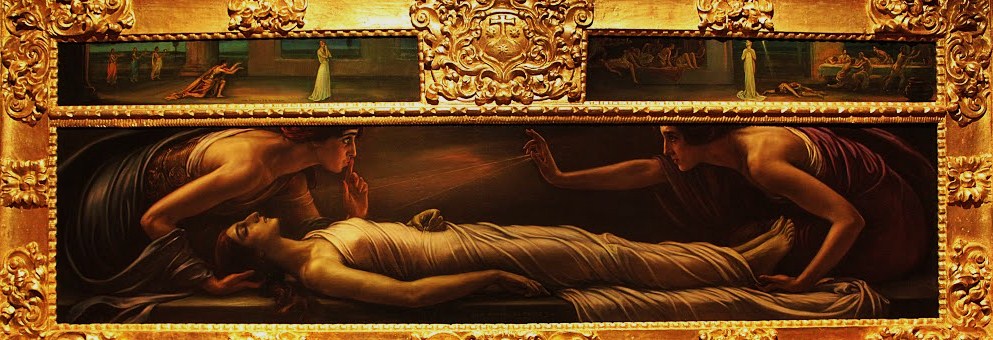 Propia de Julio de Romero de Torres; es una lectura personal del momento de gloria de Inés. Lo mejor de este retablo. Aquí está el arte del pintor en estado puro por lo que a estilo se refiere, unido a unas intuiciones simbólicas que atrapan al espectador más allá de la historia contada en las dos tablas superiores. Un argumento que, por otra parte poco interesa, pues los elementos que priman en la representación de la tercera escena son otros. Así, la plasmación de la muerte, prácticamente como si de un sueño se tratase, la visión de un cuerpo en la plenitud de su belleza, estilizado como esas esculturas griegas o egipcias que sirvieron a otros miembros de la generación artística de Julio Romero de Torres para representar el arquetipo de la belleza tanto física como espiritual; recuérdese, al respecto la obra de Mateo Inurria (Panteón de Ángel Velaz).