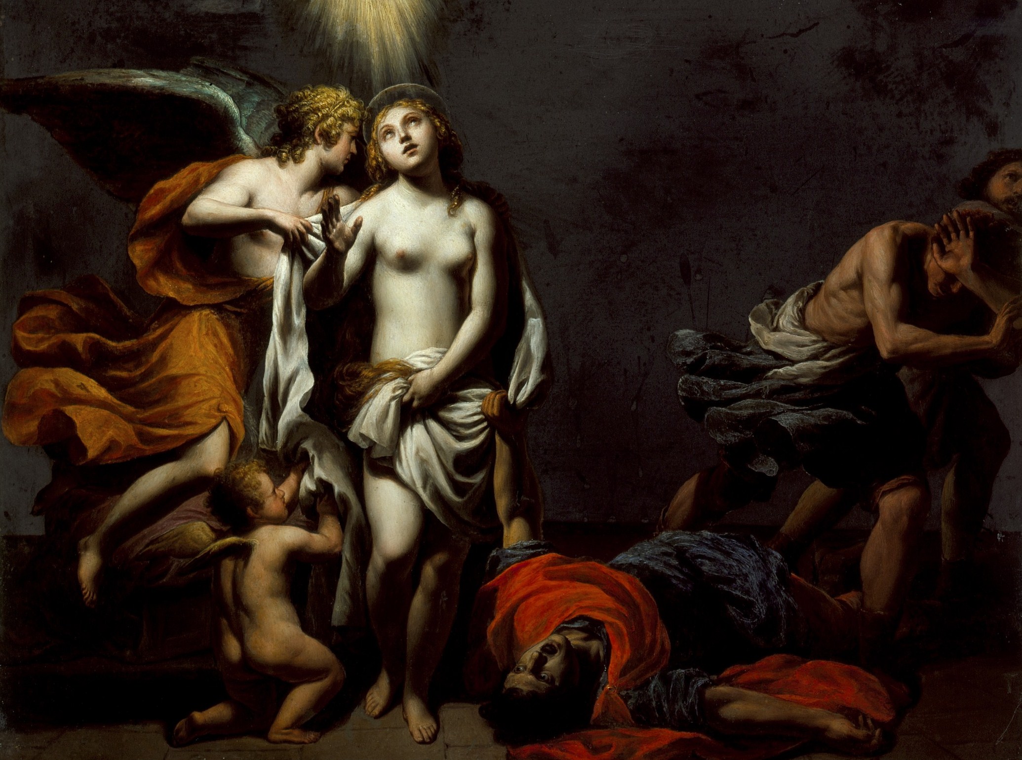 Las luces y las sombras de un espacio de mármol y orgía. Cuerpos yacentes, desnudos o cubiertos por transparentes telas. La luz cenital alumbra el terror de aquellos que, sobrecogidos ante la pureza, contemplan la muerte del mancebo, caído de bruces ante el cuerpo desnudo de santa Inés; ella en gesto de arrobamiento sosteniendo la túnica de la que ha sido despojada por los hombres.