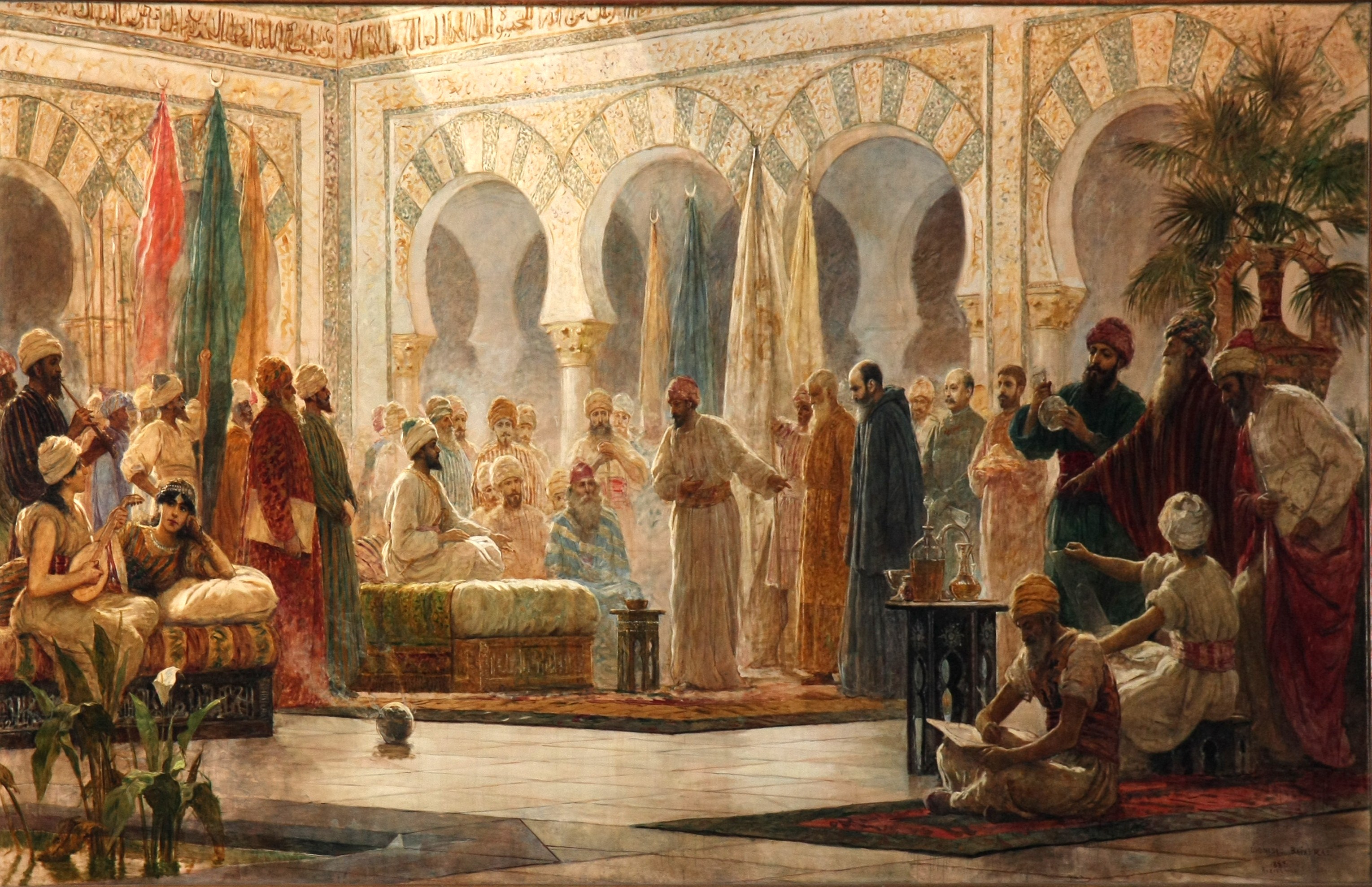 Llegué ante el alcázar y entré. Vi una plaza muy grande en la cual se levantaba otro palacio. En el patio había gentes sentadas; todos vestían sedas y sobre sus cabezas tocas del mismo tejido, con filigranas de oro. Entre los allí presentes había uno que sobresalía por su majestad. Pensé que aquel era el rey, así que me acerqué a él y me dispuse a rendirle pleitesía. Entonces me dijo mi guía: