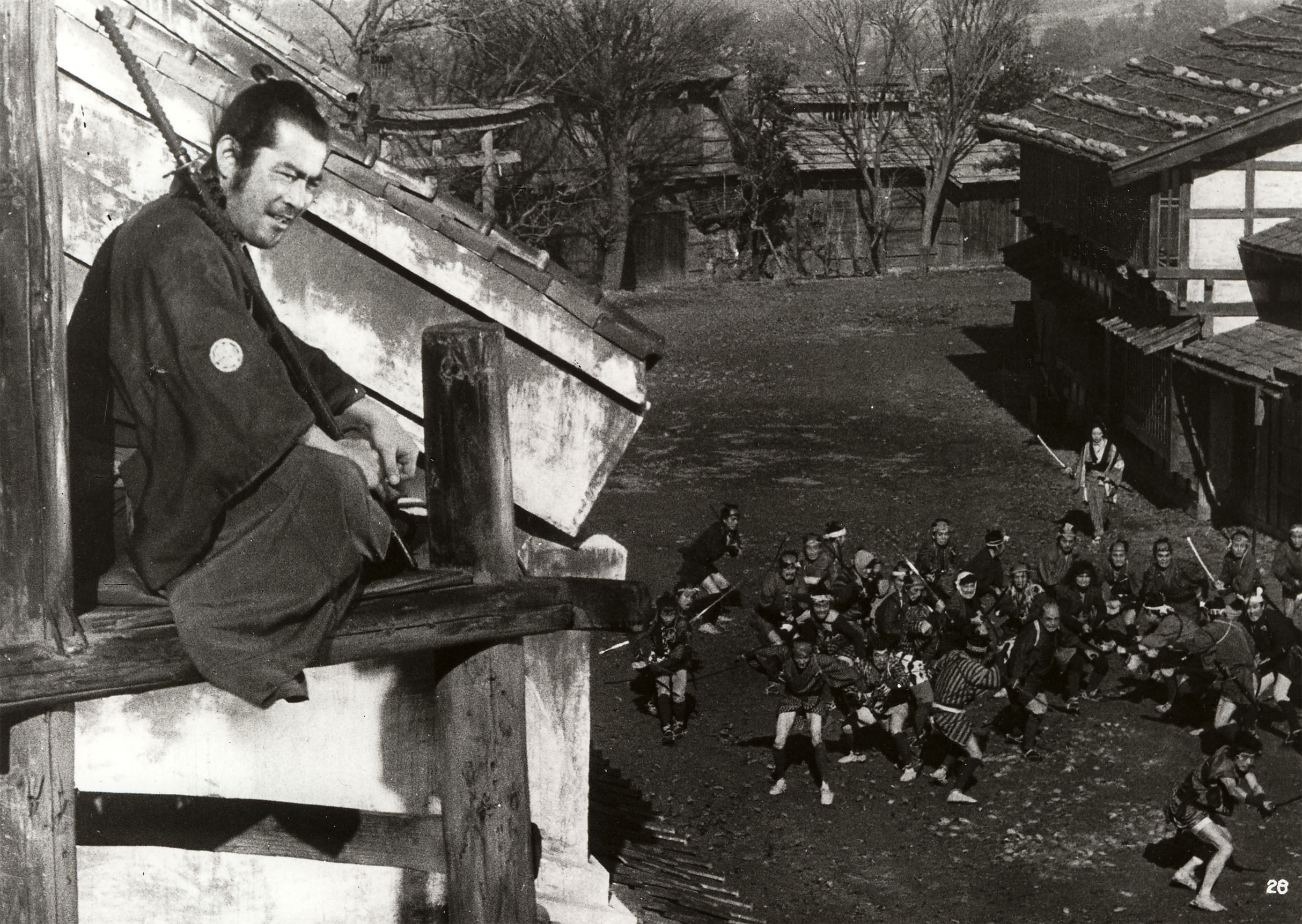 En la posada, el dueño le explicará en detalle la situación y el samurái, que es un mercenario –yojimbo- afirma que va a ser contratado por uno de los dos bandos. Este mercenario, que por no tener no tiene ni nombre, pues se inventa uno, Sanjuro –el que ronda los treinta años-, se propone terminar con esa guerra entre delincuentes que ha destruido la tranquilidad de los ciudadanos pacíficos que no aparecen en ningún momento del filme. Este último aspecto es bastante curioso, puesto que Akira Kurosawa cuidaba mucho la ambientación de sus películas. Puede recordarse al respecto la detallada recreación de la aldea de Los siete samuráis. Sin embargo, en Yojimbo, salvo los grotescos facinerosos, los degradados jefes y comerciantes (el de seda y el de sake), el posadero y el carpintero de ataúdes, no aparecen muchos más personajes. El pueblo parece uno de esos pueblos fantasmas que luego serán tan frecuentes en el western. Hay también una familia desgraciada. El marido perdió a su hermosa esposa en una apuesta. Sanjuro desprecia a las personas que se dejan arrastrar así por las miserias de la vida, igual que hacía Kikuchiyo en Los siete samuráis, el cual más allá de ese desprecio se acaba implicando en una guerra que no es la suya. Eso es lo mismo que hará Sanjuro, arriesgando su vida y volviendo a su soledad en los caminos con un lacónico Abayo (hasta la vista).