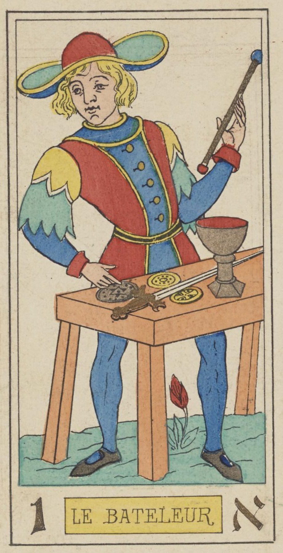 ¿Cómo es posible que un juglar haya sido el elegido para encabezar el tarot y, además, marcado con el número Uno que es el la Causa Primera? En el volumen VIII de su Mundo primitivo, Court de Gebelin afirma que la lección de este personaje es esencialmente de carácter filosófico. El universo visible es mágico y maravilloso; ¿podría no ser su Creador el ilusionista por excelencia, el gran Prestidigitador que nos deslumbra con sus malabarismos? La confusión y el remolino universal nos impiden ver la realidad. Estamos engañados por la apariencia producida por fuerzas en movimiento que son desconocidas para nosotros. Por lo tanto, la Primera Causa es un Mago, sin embargo, como esta Primera Causa se refleja en todas las cosas que son activas, el rasgo del tarot que lo abre, de una manera general, corresponde a todo principio de actividad. En el Universo, él es Dios, visto como el gran poder que provoca todo lo que está consumado en el Cosmos; en el hombre es el asiento de la iniciativa individual, el centro de percepción, de consciencia y de poder de la voluntad. Es el Ego llamado para construir nuestra personalidad, porque lo individual tiene la misión de crearse a sí mismo.