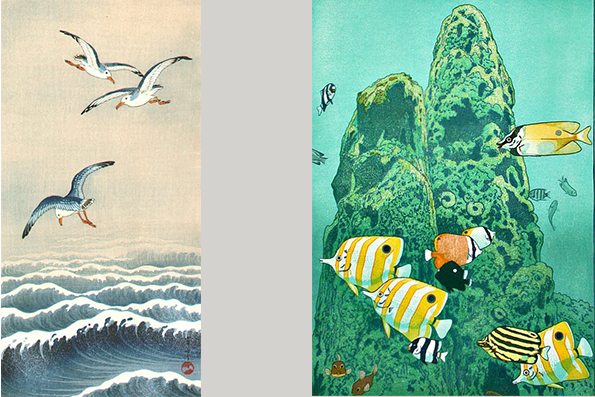 cortejo de peces de todas las especies, figuras y colores, y de otros seres acuáticos que viven en el mar. La dorada, el pez espada, el violento tiburón, la débil sardina, juntamente con el pulpo de fuertes tentáculos, cangrejos y conchas, todos ostentando la preciosa librea de la princesa Otohime, salen al encuentro de Urasima Taro, le dirigen afectuosas palabras de bienvenida y le explican con todo respeto y cortesía el placer inmenso que inunda sus corazones por su tan amable visita. Urasima Taro se halla anonadado ante aquellas muestras de excesiva veneración y cortesía, y no encuentra palabras con qué agradecerlo; pero, al mismo tiempo, su corazón rebosa de gratitud y no tiene miedo, porque sabe que en todo ello hay sinceridad y amor verdadero.