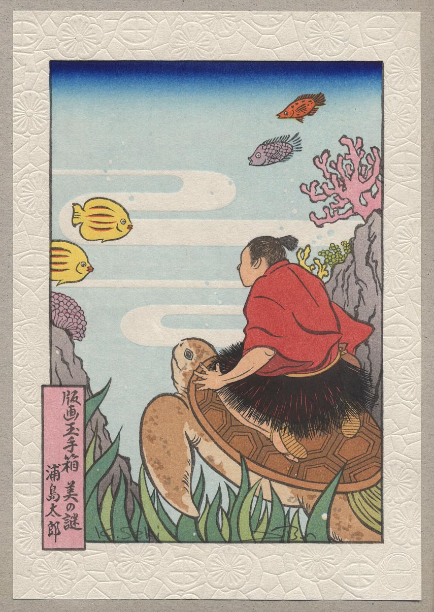 Un día que el bueno de Urasima Taro volvía de su trabajo muy alegre y satisfecho por la abundante pesca cogida, observó que, no lejos de la orilla del mar, una cuadrilla de muchachos bulliciosamente se entretenía en atormentar a una pequeña tortuga que había encontrado en la arena donde se divertían.
