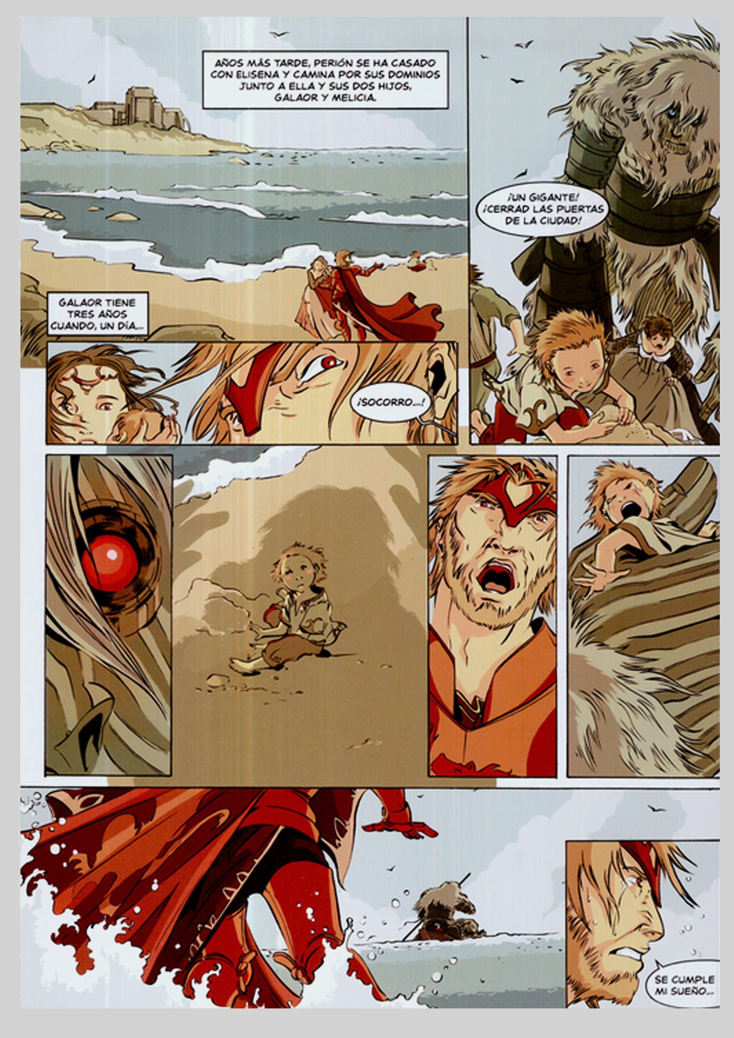 Los principales personajes del Amadís de Gaula se encuentran representados en esta narración gráfica. Aquí están los amores de Perión de Gaula y la princesa Elisena, hija del rey Garínter; unos amores que se desarrollan a escondidas de los principios sociales y que dan lugar al nacimiento de un hijo que no puede vivir salvo que Dios le otorgue la vida que su propia madre le niega al arrojarlo al mar en un arca. Pero el destino guarda un importante futuro para Amadís Sin Tiempo, hijo de Rey; por ello es recogido por Gandales cuya esposa criará a este Doncel del Mar junto a su propio hijo Gandalín. Así la vida de Amadís se desarrolla durante sus primeros años en las posesiones de Gandales hasta que llega a su castillo el rey Lisuarte y le ofrece a Amadís la posibilidad de ser criado en su corte para aprender los principios de la caballería. Amadís acepta. Mientras esto sucede, Perión de Gaula ha contraído matrimonio con Elisena, fruto del cual son Galaor y Melicia. El niño Galaor será raptado por el gigante Gandalás al cual le fue profetizado que un día, el hijo de Perión de Gaula le hará recuperar las islas que le fueron arrebatadas.