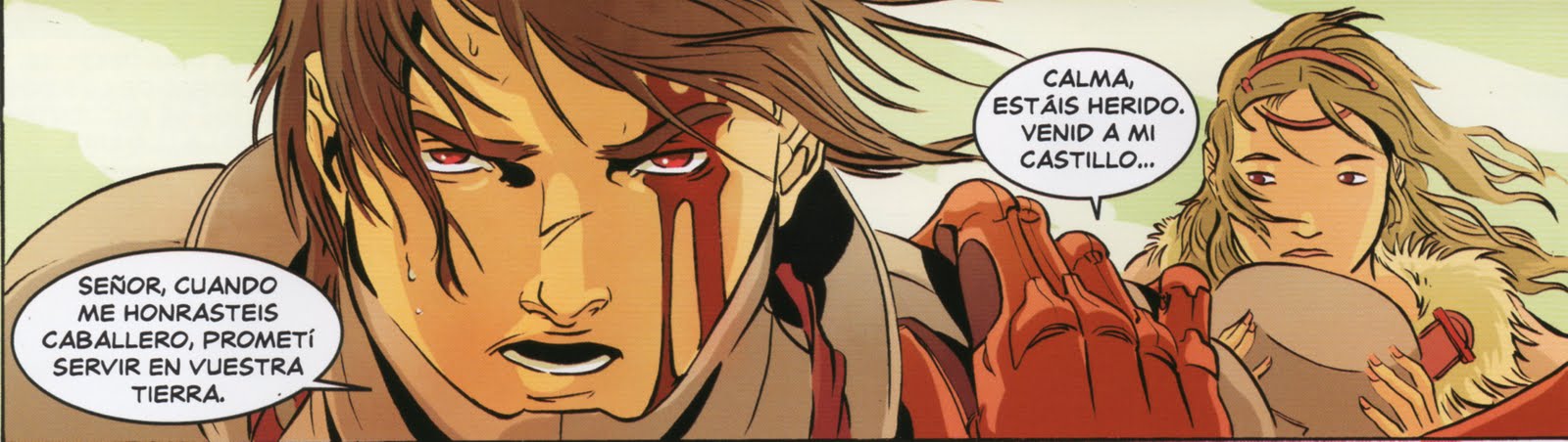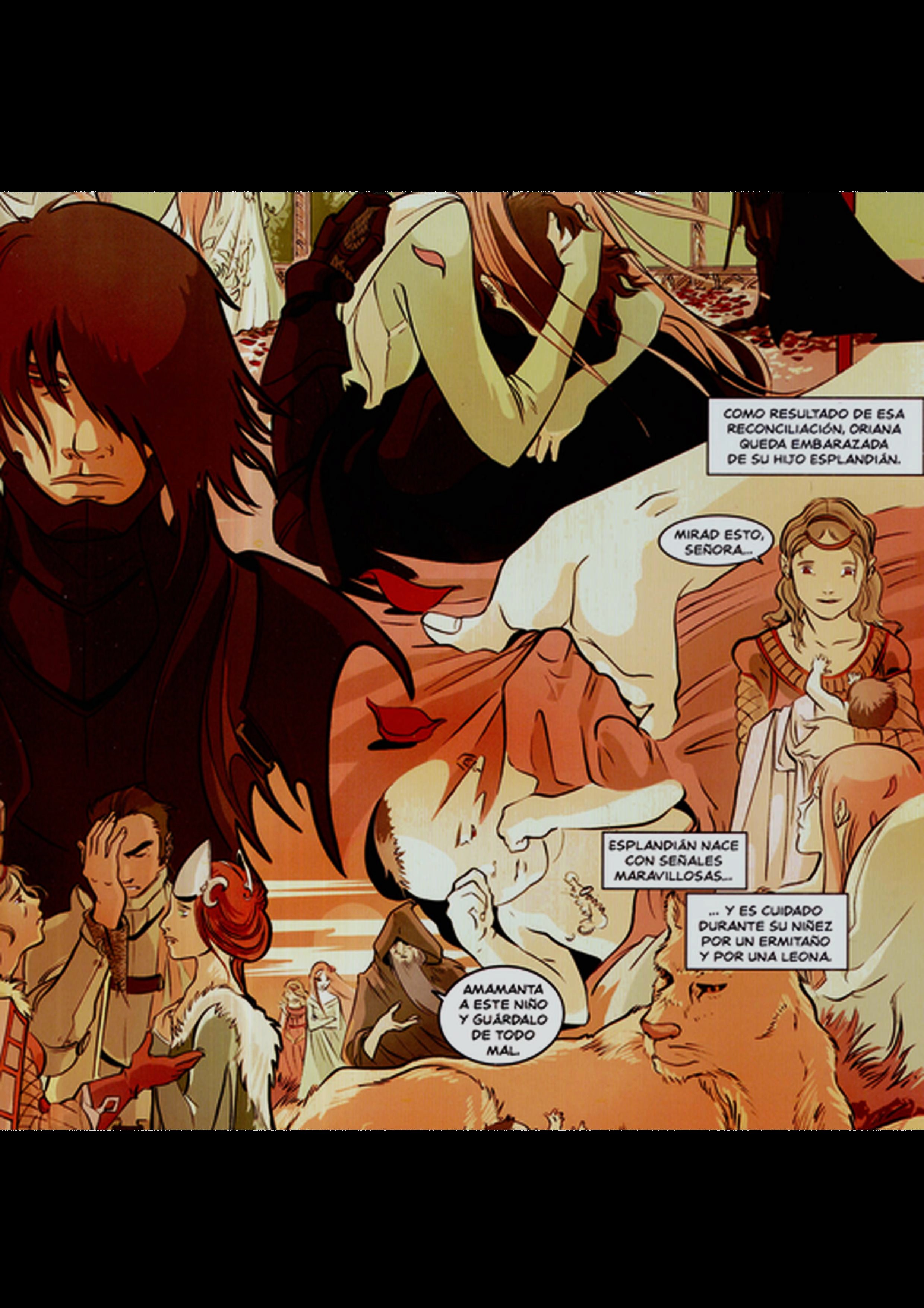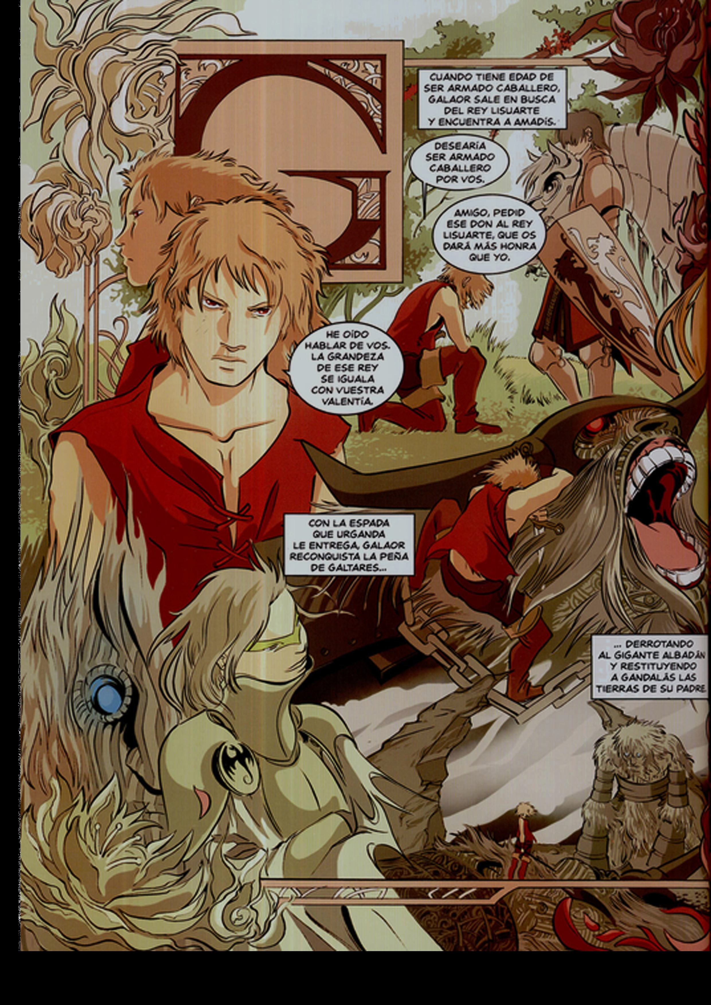 Uno de los mayores especialistas en el arte secuencial -que es otro de los nombres que se les da a los tebeos- es Scott McCloud. En su libro Hacer cómics. Secretos narrativos del cómic, el manga y la novela gráfica enumera una serie de características que se cumplen en la versión del Amadís de Gaula hecha por Emma Ríos; me ha parecido interesante recorrerlas y presentar aquí un resumen de ellas. Pueden servir de guía para aquel lector que quiera acercarse a la recreación de esta obra. Scott McCloud señala que los personajes del manga son icónicos, es decir, muestran sencillez y emotividad, tanto en sus figuras como en sus rasgos faciales lo cual persigue –y esto es una característica general del manga- una identificación del lector con el personaje. Por otra parte, la variedad de subgéneros narrativos que admite el manga es lo que hace posible que sus técnicas expresen cualquier tipo de historia, incluso una extraída de un mundo tan alejado al contemporáneo como es el de la fantasía medieval. Para conseguir una fuerte sensación de lugar, el dibujante manga tiene que cuidar al detalle la configuración del entorno en el que se mueven sus personajes. Hubo otro ilustrador de la fantasía medieval que consiguió plasmar en toda su plenitud el mundo de las aventuras caballerescas, este fue Harold Foster con su personaje El Príncipe Valiente; en su historia, Foster consigue una recreación arqueológica aparentemente real. No es este el efecto que persigue Emma Ríos; en sus dibujos lo que encontramos es una arquitectura (más que un diseño de decoración y elementos de interior) mediante la cual se provoca en el lector una serie de sensaciones, principalmente en la descripción de los palacios, de un gótico no muy identificable con la realidad, puesto que lo que interesa, como afirma McCloud, es la expresión de una intuición, en el Amadís de Gaula siempre cercana a lo onírico o al mundo de la fantasía que, al fin y al cabo, es el de las aventuras caballerescas.