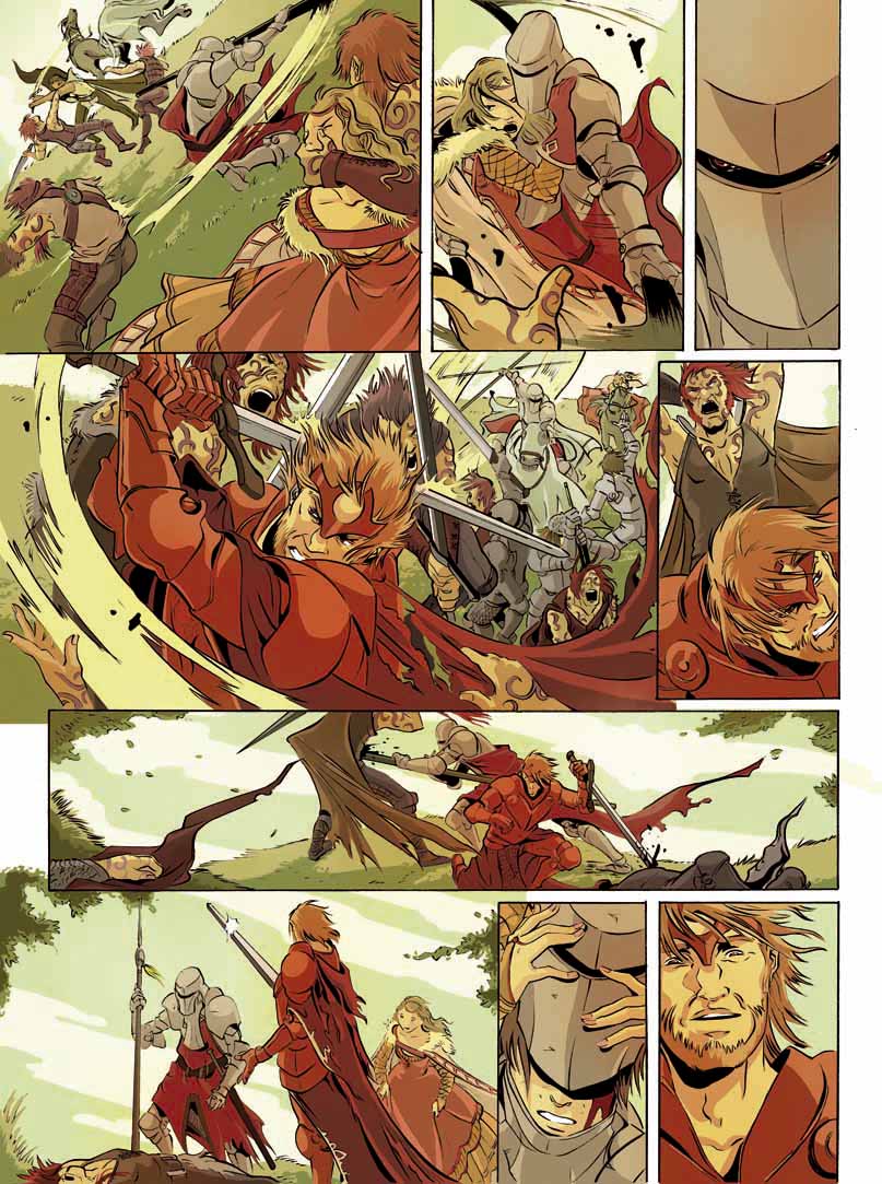 Cuando Amadís cuenta con doce años, hasta la corte de Lisuarte llega el rey Falangriz con su hija Oriana. De ella se enamora Amadís, motivo por el cual tempranamente el doncel pide ser nombrado caballero, para ganar honra y hacerse merecedor del amor de la princesa. Justamente por ese tiempo, Perión de Gaula se presenta ante Lisuarte, necesita ayuda para enfrentarse a Abiés de Irlanda; es el momento oportuno para Amadís. Gracias a la intervención de Oriana, Perión accede a nombrar caballero a su desconocido hijo. El momento de la investidura es crucial en la biografía de todo héroe caballeresco, pues marca el comienzo de la aventura. Amadís de Gaula comienza su errar por los caminos en diversos episodios reflejados en los dibujos de Emma Ríos: salva a Perión y a una doncella de Oriana; derrota al rey Abiés, recupera su pasado gracias al anillo y a la espada que le acompañaron en su exilio al mar cuando fue echado a las aguas al poco de nacer. Sus victorias le llevan a la culminación de sus amores con Oriana; esta engendrará a un niño, Esplandián, que será amamantado por una leona. Pero la vida de Amadís también conocerá momentos terribles, y el peor de ellos será cuando Oriana, llevada por los celos, le rechace como enamorado. Amadís se retira de la vida aventurera, se refugia en las montañas hasta que decide regresar como Beltenebros para enfrentarse al mayor peligro con el que se va a encontrar: el Endriago. Los autores consiguen captar perfectamente este argumento en las treinta páginas que desarrollan las aventuras mencionadas, aunque evidentemente no las cuentan en detalle sino que se plasman en los dibujos unas impresiones generales que transmiten lo que fue un grueso volumen en 1508.