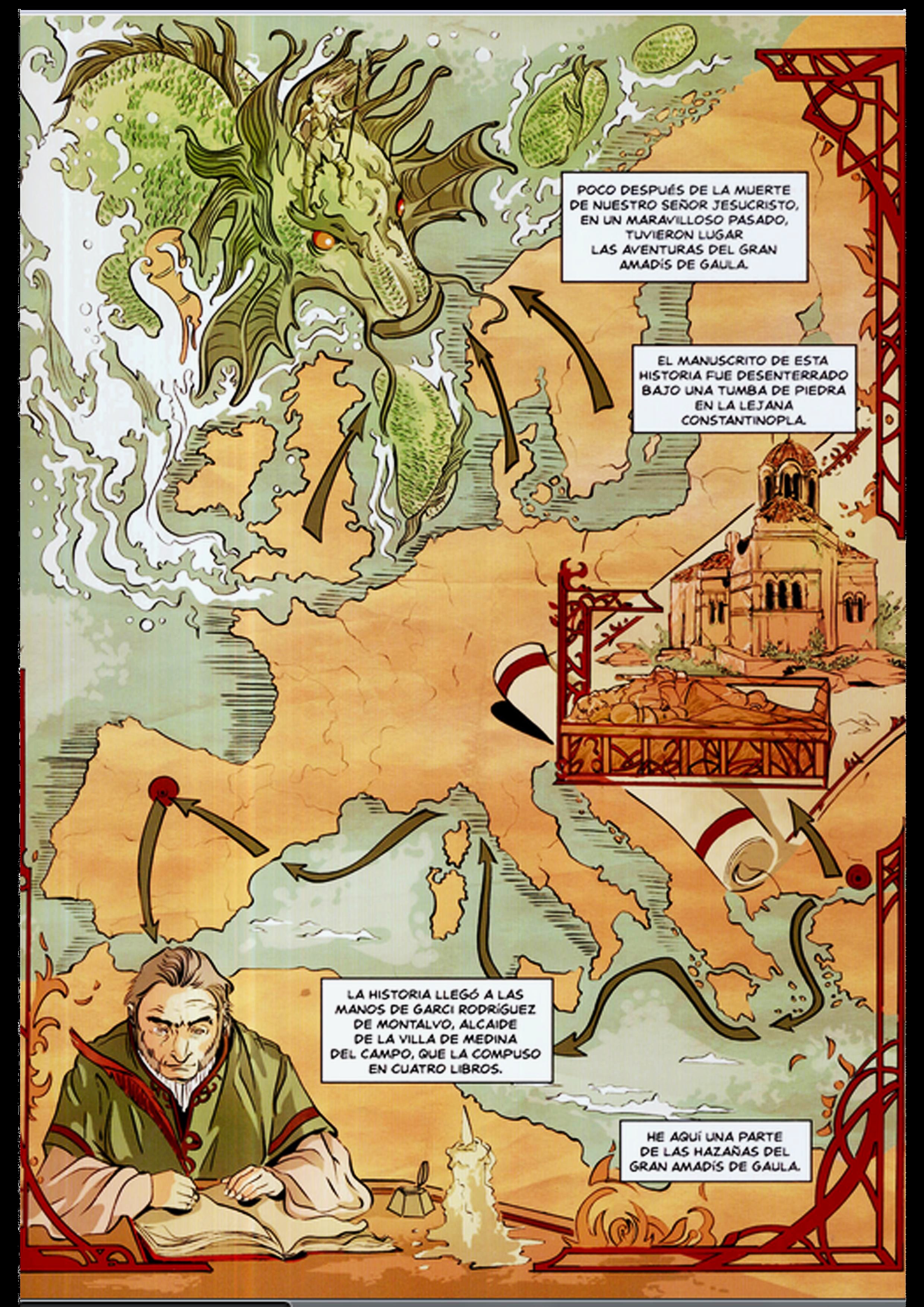 Como no podría ser de otro modo, la historia comienza con una primera ilustración a página completa en la que desde la pluma de Garci Rodríguez de Montalvo va surgiendo un mundo, en un mapa que señala tanto el territorio de la aventura amadisiana como el camino recorrido por el primitivo manuscrito encontrado bajo una tumba de piedra en la lejana Constantinopla, llegado hasta la villa castellana de Medina del Campo, el lugar de Rodríguez de Montalvo. La voluntad de acercamiento al mundo ficticio se encuentra en una decoración que imita, sencilla pero eficazmente, las grecas con las que se enmarcan los textos manuscritos y en la parte superior izquierda un dragón que surge del océano para recordar que, al fin y al cabo, más allá de unos lugares ciertos (el mapa de Europa, Constantinopla o Medina del Campo) se alza un espacio de la maravilla en el que los héroes caballerescos van a encontrar su razón de existir.