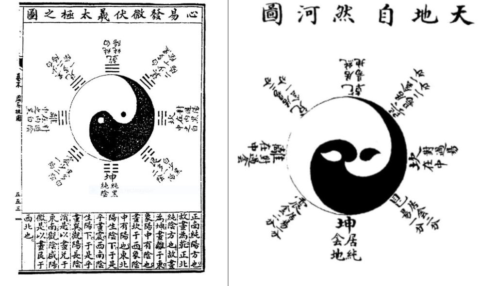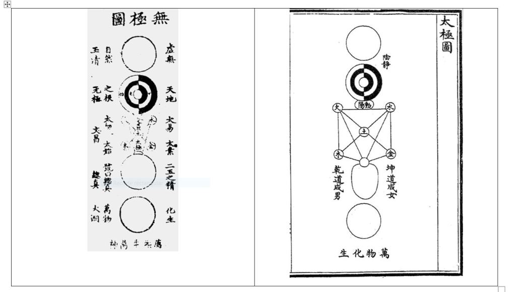 El siguiente pensador al que haremos referencia es Zhou Dunyi. No conoció a Sao Yong, sin embargo, muestra las mismas inquietudes cosmológicas. Zhou Dunyi era adepto al budismo. Su pensamiento se basa, al igual que el de Shao Yong en el Libro de las mutaciones. Recupera la cuestión cosmológica que había sido olvidada desde el periodo Han. Para establecer su diagrama de Taiji probablemente se basara en otros dos anteriores atribuidos a Chen Tuan, el Diagrama del infinito y el Diagrama de lo que es anterior al cielo. Desde la controversia cosmológica, Zhou Dunyi alcanza la noción de Sin culmen-Culmen supremo, wuji er taiji (無極 而太極), nueva versión del wu-you del Daodejing.